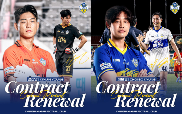 [충청뉴스 유규상 기자] 충남아산프로축구단(구단주 오세현, 대표이사 이준일, 이하 충남아산FC)이 베테랑 골키퍼 김진영, 수비수 최보경과 재계약했다.