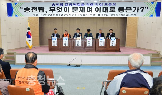 충청남도의회(의장 이준우)가 '송전탑 건설의 문제점과 갈등 해소 방안'을 주제로 6일 서산시청대회의실에서 각계 전문가 및 주민 등 150여명이 참석한 가운데 의정토론회를 개최했다.