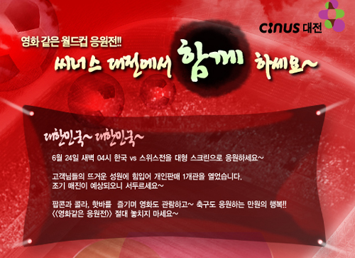 씨너스 대전은 6월 24일 새벽 4시부터 열리는 한국과 스위전을 영화관에서 상영한다고 밝혔다.