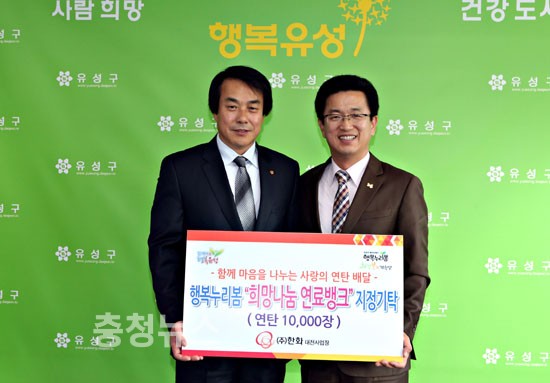 대전시 유성구(구청장 허태정)는 12일 구청 행복사랑방에서 행복누리봄 기탁식을 가졌다. 이번 기탁은 (주)한화 대전사업장(사업장장 장길회)에서 연탄 1만장(500만원 상당)을 관내 소외계층에 써달라고 유성구에 전달했다.