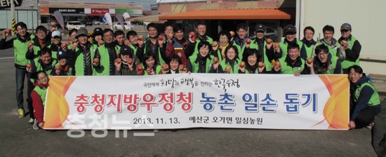 충청지방우정청(청장 김영수)은 13일 충남 예산군 오가면의 사과재배 농가를 방문해 농촌 일손 돕기로 훈훈한 사랑의 나눔을 실천했다.