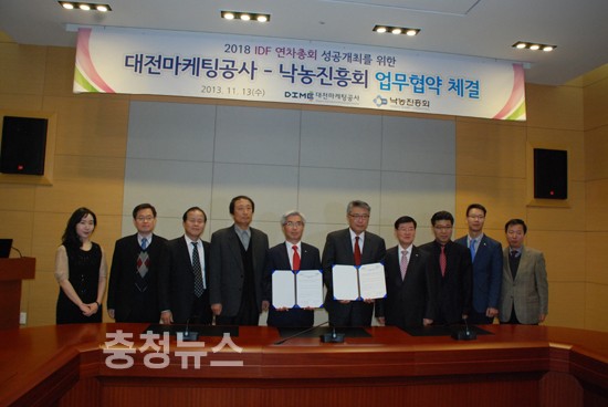 대전마케팅공사(사장 채훈)와 (사)낙농진흥회(회장 이근성)는 지난 10월말 일본 요코하마에서 2018년 IDF(국제낙농연맹) 연차총회를 대전으로 유치한데 이어, 대회를 성공적으로 개최하기 위한 업무협약을 체결했다.