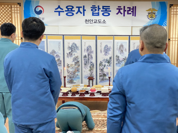 [충청뉴스 유규상 기자] 천안교도소는 지난 15일 설 명절을 맞아 수용자들을 위한 합동차례 교화행사를 진행했다. 정성껏 차려진 차례상 앞에 선 수용자들은 조상의 음덕을 기리고 가족을 떠올리며 깊은 절을 올렸다.