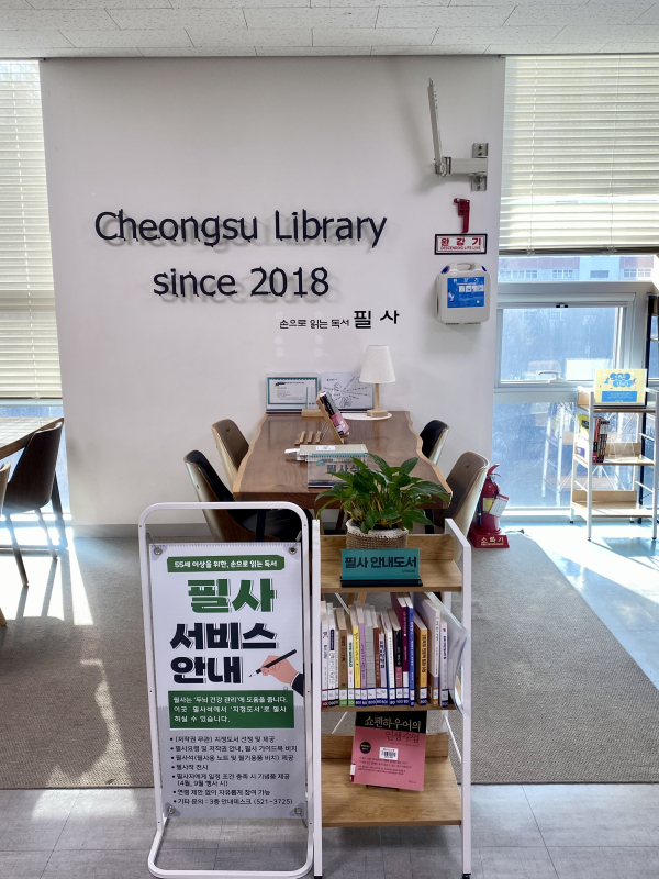 청수도서관은 3층 종합자료실 큰글자도서 코너에 전용 필사석을 마련하고 필사 요령과 저작권법 등에 대해 안내하고 있다. 리더스원 출판사의 지원으로 필사용 공책도 제공할 예정이다.