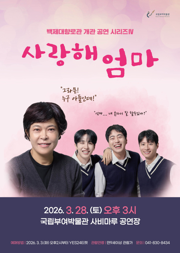 [충청뉴스 조홍기 기자] 국립부여박물관(관장 신영호)은 지난해 12월 개관한 '백제대향로관' 연계 공연시리즈를 이어가고 있다. 그 일환으로 오는 3월 28일(토) 15시에는 성인 대상 연극 <사랑해, 엄마>가 사비마루 공연장 무대에 오른다. 사비마루 공연장은 국립부여박물관 내에 위치한 중극장으로, 관람객은 공연 관람과 함께 백제대향로관 및 사비백제 관련 전시를 연계해 즐길 수 있다.