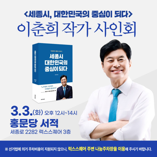 이춘희 예비후보는 오는 3월 3일(화) 오후 12시, 세종시 조치원읍에 위치한 향토 서점 ‘홍문당서적’에서 저서 <세종시, 대한민국의 중심이 되다> 출간 기념 사인회를 개최한다고 밝혔다.