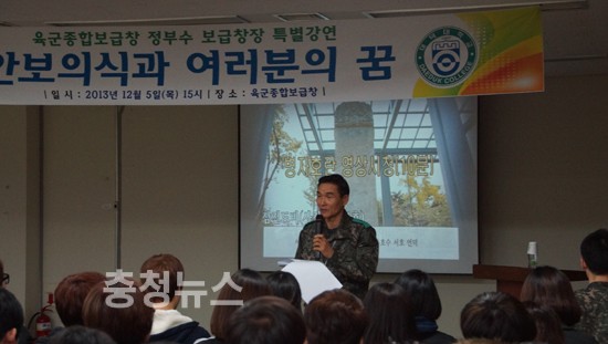 육군 종합보급창에서 열린 이번 특강은 “안보의식과 여러분의 꿈” 이라는 주제로 국방물자과 1, 2학년 학생 100 여명이 참석해 올바른 안보관 함양과 미래의 군 간부가 갖춰야 할 기본적인 소양을 배우는 기회를 가졌다.