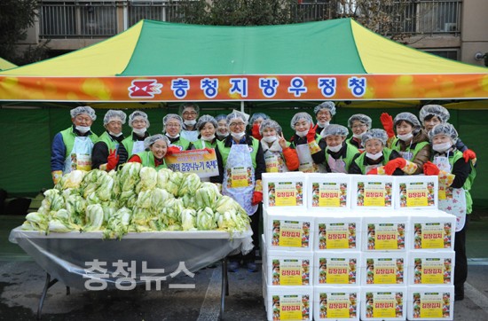 충청지방우정청(청장 김영수)은 6일 어려운 이웃에게 훈훈한 마음을 전하기 위해 우정청 직원 20여명이 둔산종합사회복지관, 지역기관 및 단체 200여명과 함께 ‘사랑의 김장나누기 행사’를 가졌다고 밝혔다.
