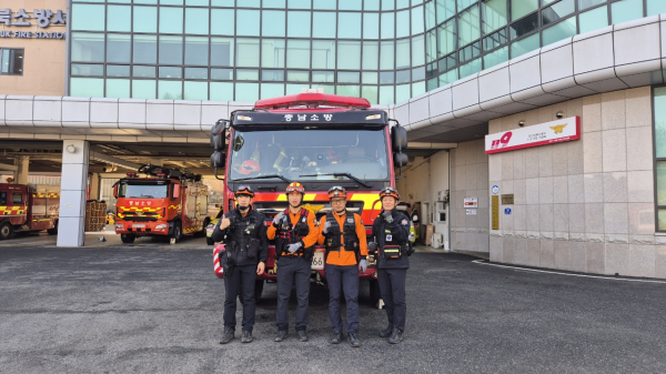 현장에 출동한 (좌측부터) 소방사 이규복, 소방위 김광태, 소방장 홍성호, 소방교 박원기 대원