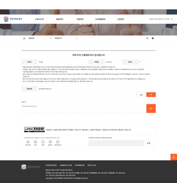 천안서북소방서 홈페이지 ‘칭찬합시다’ 게시판 “에 올라 온 글
