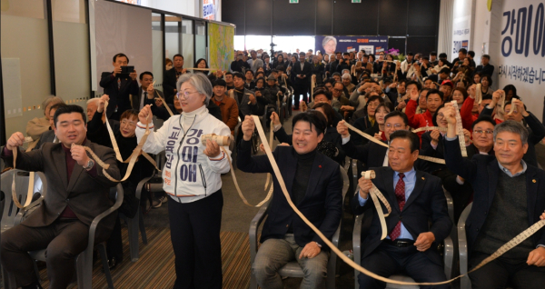 행사의 대미는 참석자 전원이 참여한 ‘종이끈 커팅식’이 장식했다. 캠프 구성원들이 5일간 정성껏 준비한 종이끈을 자른 뒤, 강 예비후보와 지지자들은 한글이 정성스럽게 쓰인 한지를 공중에 높이 던지며 세종 교육의 비상을 염원했다.
