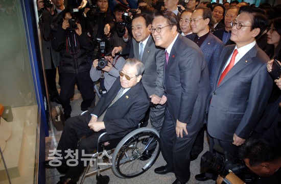 ▲ JP는 이완구 새누리당 의원이 끄는 휠체어에는 정우택 최고위원, 정진석 사무총장 심대평 위원장이 모습을 드러냈다.