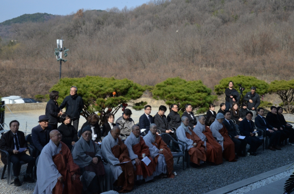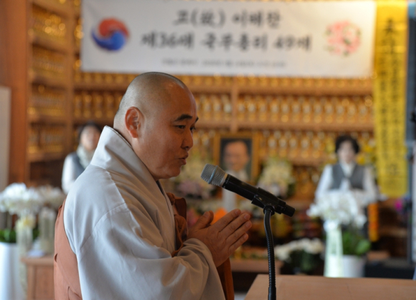 1부 추모 행사는 광제사 주지 탄대스님의 집전 아래 반야심경 봉독으로 문을 열었다. 이어지는 추모사에서 경원사 주지 효림스님은 고인을 위해 직접 지은 한시를 낭독하며 "나라의 큰 어른으로서 막힌 강을 열어 흐르게 하고, 역사의 물줄기를 바로 세운 분"이라고 고인을 기렸다.