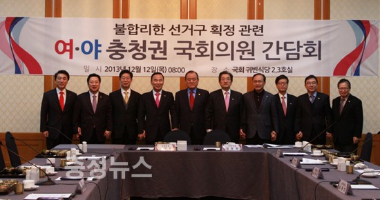 대전과 충남·북, 세종 등 여야 충청권 국회의원들은 12일 첫 열린 여야 국회의원 간담회에서 ▲선거구 획정 개선을 위한 합리적 단일화 안을 2014년 1월 15일까지 마련해 여야 충청권 의원 명의로 양당 지도에 건의하기로 하는 등 3개 항에 대해 합의했다.