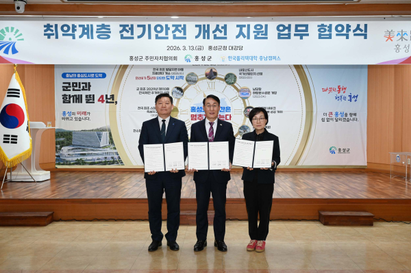 [충청뉴스 박영환 기자] 홍성군은 지난 13일 군청에서 한국폴리텍대학 충남캠퍼스, 홍성군주민자치협의회와 함께 ‘취약계층 전기안전 개선 지원 업무 협약’을 체결했다고 16일 밝혔다.