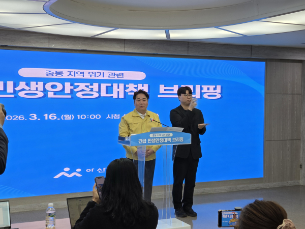 [충청뉴스 유규상 기자] 아산시가 16일 시청 브리핑룸에서 기자회견을 갖고 중동 지역 긴장 고조와 전쟁 장기화로 인한 국제 유가 상승과 물류 불안에 대응하는 긴급 민생안정 대책을 발표했다.