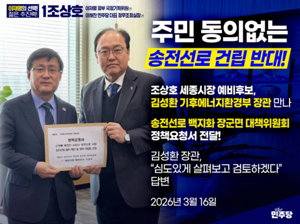 조 예비후보는 면담을 마치며 “시민의 건강권과 재산권, 그리고 세종의 품격을 지키기 위해 송전선로 계획이 백지화될 때까지 시민들과 함께 끝까지 투쟁하겠다”고 강한 의지를 밝혔다.