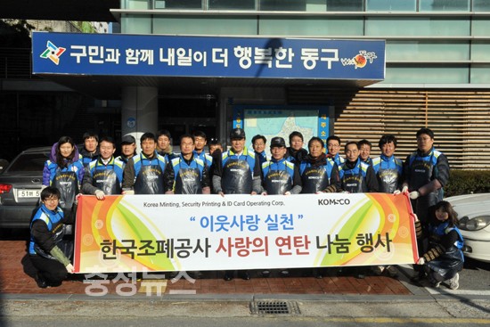 한국조폐공사(사장 윤영대, www.komsco.com) 사장 및 임직원 25명은 13일 대전시 동구일대에서 장애인 및 기초생활수급 29가구를 대상으로 연탄 및 생필품(100만원 상당)을 지원하는 “사랑의 연탄나눔 행사”를 실시했다.