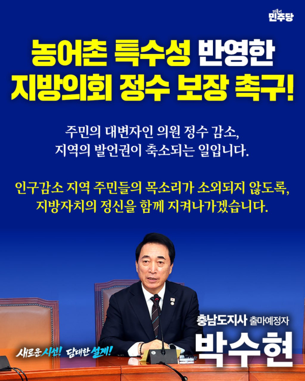 [충청뉴스 조홍기 기자] 충남도지사 출마를 선언한 박수현 국회의원(더불어민주당 충남 공주·부여·청양)은 17일 “농어촌의 특수성을 반영한 기초·광역의회 의원정수 보장이 필요하다”고 밝혔다.
