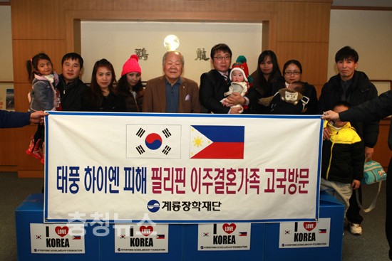 이인구 계룡장학재단 이사장(계룡건설 명예회장, 한국다문화가족정책연구원 고문)은 지난 14일 오전 11시 계룡건설 10층 회의실에서 태풍 하이옌으로 피해를 입은 필리핀 이주결혼가족 4가족 14명의 고국방문을 지원하는 행사를 가졌다.