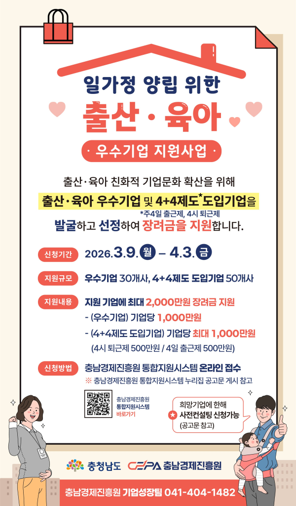 [충청뉴스 박영환 기자] 충남경제진흥원이 도내 중소기업을 대상으로 ‘2026년 출산·육아 우수기업 지원사업’ 참여기업을 모집한다고 19일 밝혔다.