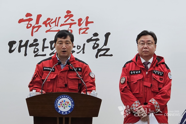 김영명 충남도 환경산림국장과 정연국 중부지방산림청장은 19일 도청 프레스센터에서 기자회견을 열고 3월 14일부터 4월 19일까지를 ‘봄철 대형산불 특별대책기간’으로 정해 산불 예방과 초동 대응을 위한 협력체계를 운영한다고 밝혔다.