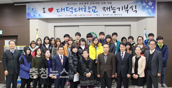 대덕대학교(총장 홍성표)에서는 ‘I ♡ 대덕대학교’ 프로그램으로 수행된 결과물에 대한 재능나눔 기부식 및 발표회를 관련 업체 대표들이 참석한 가운데 지난 16일 정곡관 세미나실에서 진행했다.
