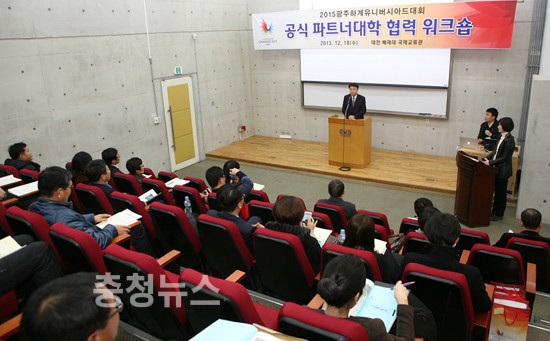 배재대학교 2015 광주하계유니버시아드 조직위는 18일 오후 배재대학교 국제교류관 세미나실에서 배재대 등 전국 8개 공식 파트너 대학 관계자 50여명을 대상으로 협력 방안을 모색하는 워크숍을 가졌다.