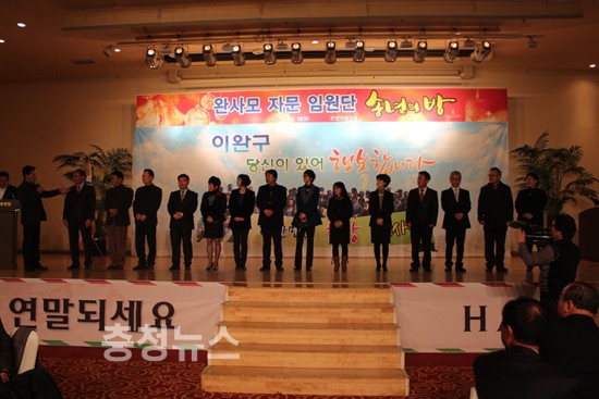 새누리당 이완구 의원의 지지모임인 ‘완사모’ (이완구를 사랑하는 사람들의 모임)충청본부는 17일 오후 6시 반 아산시 온양관광호텔 대연회장에서 ‘완사모 자문임원단 송년의 밤’ 행사를 개최하였다.