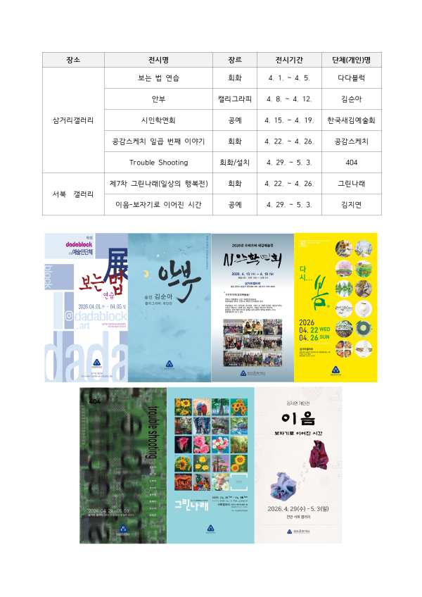 삼거리 갤러에서는 △1~ 5일, ‘보는 법 연습’ 회화전 △8~ 12일, ‘안부’ 캘리그라피전 △15~ 19일, ‘시인학연회’ 공예전 △22~ 26일, ‘공감스케치 일곱 번째 이야기’ 회화전 △29일~ 5월 3일, ‘Trouble Shooting’ 회화전이 진행된다.