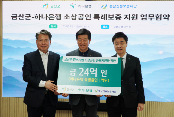 [충청뉴스 박영환 기자] 충남신용보증재단은 금산군, 하나은행과 '금산 소상공인 특례보증의 추가 지원' 업무협약을 체결했다고 31일 밝혔다.