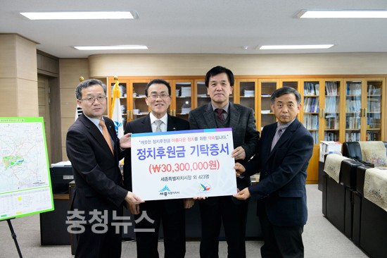 세종특별자치시(이하 세종시, 시장 유한식)가 24일 오후 시장실에서 세종시선거관리위원회(이하 선관위, 사무처장 엄흥석)에 정치후원금을 기탁했다.