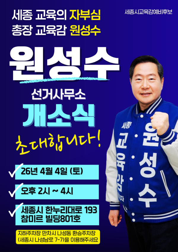 이날 개소식은 박수현 국회의원을 비롯해 지역 정·재계 주요 인사, 교육계 관계자 및 지지자 등이 참석한 가운데 단순한 사무실 오픈을 넘어, 세종의 아이들과 교육 공동체의 미래를 논하는 ‘비전 선포의 장’으로 꾸며질 예정이다.