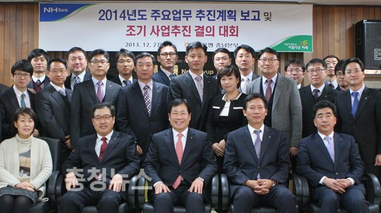 NH농협은행 충남영업본부(본부장 윤동기)는 지난 27일(금) 영업본부 회의실에서 영업본부 소속 전 직원이 참석한 가운데“2014년도 업무계획 보고 및 조기 사업추진 결의대회”를 개최했다.