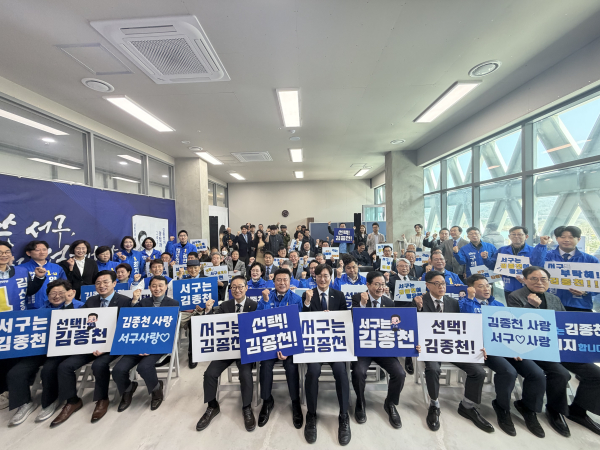 [충청뉴스 김용우 기자] 더불어민주당 김종천 서구청장 예비후보가 11일 대전 서구 갑천 호수공원 옆에 위치한 '서구사랑 캠프'에서 선거사무소 개소식을 열고 본격적인 세몰이에 나섰다.