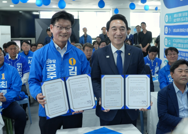 [충청뉴스 공주 = 조홍기 기자] 더불어민주당 공주시장 후보로 확정된 김정섭 예비후보는 12일 오후 자신의 선거사무소에서 충남도지사 경선 후보로 나선 박수현 국회의원과 함께 정책연대 협약식을 가졌다.