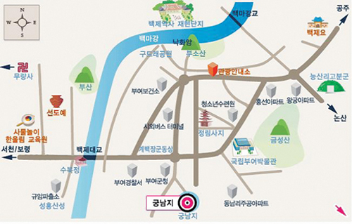 ▲ 부여 궁남지 부여읍 남쪽에 위치한 백제시대 별궁 연못이다. 백제 무왕 때 만들어진 것으로 보이며, “궁궐의 남쪽에 연못을 팠다”는 「삼국사기(三國史記)」의 기록을 근거로 궁남지라 부른다. 이 연못에 대해서는 「삼국사기」 무왕조(武王條)에 “3월에 궁성(宮城) 남쪽에 연못을 파고 물을 20여리나 되는 긴 수로로 끌어들였으며, 물가 주변의 사방에는 버드나무를 심고, 못 가운데에는 섬을 만들어 방장선산(方丈仙山)을 본떴다”고 되어 있다. 사실, 백제에서 왕궁 근처에 연못을 만드는 전통은 이미 한성시대(漢城時代)부터 시작되었다. 다만, 한성시대에 조영된 왕궁에 딸린 연못은 아직 발굴된 바 없어서 그 실체를 확인하지 못하고 있다. 그에 비해 웅진(熊津)시대의 왕궁이었던 공산성(公山城) 안에서는 당시의 것으로 판단되는 연못이 왕궁지(王宮址)로 추정되는 건물지(建物址)와 함께 발굴되었다.공산성에서 발굴된 이 연못은 바닥이 좁고, 위로 올라갈수록 넓어지는 원형의 연못인데 직경 7.3m, 바닥 직경 4.8m, 그리고 깊이 3m의 크기를 보이고 있다. 이를 토대로 보면 백제에서 왕궁 근처에 연못을 만드는 전통은 매우 오래된 것임을 알 수 있다. 그러나, 한성시대와 웅진시대의 연못은 그자체만 확인될 뿐 여기에서와 같은 삼신산(三神山)의 존재는 확인되지 않는다. 궁남지와 관련된 또 다른 기록은 「삼국사기(三國史記)」 의자왕(義慈王) 15년조에 보이는 “2월에 태자궁(太子宮)을 지극히 화려하게 수리하고 왕궁 남쪽에 망해정(望海亭)을 세웠다”는 기록이다. 망해루(望海樓)나 망해정(望海亭)에서 대지(宮南池)를 바라보면 바다와 같이 시원한 느낌을 받았을 터이고, 이렇게 바다와 같이 큰 연못을 왕궁 근처에 만드는 것이 백제가 처음이었음을 알 수 있다. 즉, 신라의 경우 문무왕대(文武王代)에 안압지(雁鴨池)를 만들고, 그 안에 삼신도(三神島)를 조성하며, 주변에 임해전(臨海殿)을 세우게 되는데, 이 모든 것이 기본적으로 백제의 궁남지와 같은 개념이었음을 알 수 있다. 그런 점에서 백제의 조원(造苑) 기술은 삼국 중 으뜸이었으며, 통일신라의 조원에 큰 영향을 끼쳤음을 확인할 수 있다. ▲ 궁남지 가는 길