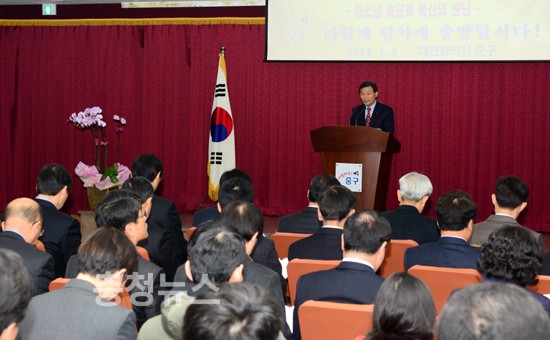 대전시 중구(구청장 박용갑)은 2일 구청 대회의실에서 간부공무원 등 250여명의 직원이 참석한 가운데 ‘2014년 시무식’을 개최하고 새해 새출발을 다짐했다.