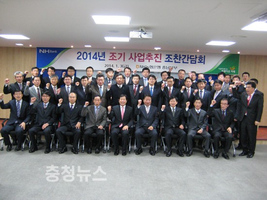 NH농협은행 충남본부(본부장 윤동기)는 갑오년 두 번째 영업일인 3일 충남 관내 사무소장 38명 등과 함께 '2014년도 조기 사업추진 분위기 붐 조성'을 위한 조찬간담회를 공주시 소재 농협 공주시지부 회의실에서 개최했다.