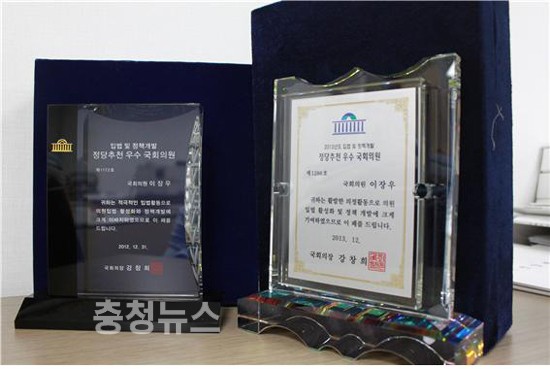 새누리당 이장우 국회의원(대전 동구)이 강창희 국회의장이 수여하는 2013년도 입법 및 정책개발 정당추천 우수 국회의원에 선정되는 기쁨을 안았다.