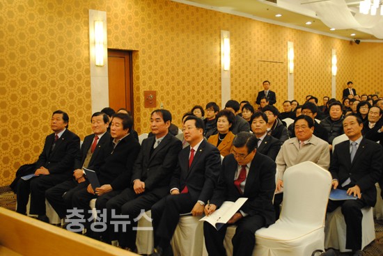 ▲ (안필응 대전시의원, 김종성 동구의회 의장, 이상태 전 시의회 의장, 곽수천 대전시의원, 최주영 전 동구의회 의장, 남진근 대전시의원 등) 박병호 전 동구청장, 진동규 전 유성구청장, 송인석 청년위원장, 김문영 전 시당 사무처장 등이 참석했다