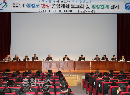 충남도교육청(교육감권한대행 부교육감 전찬환)은 23일 본청 대강당에서 교육청 전 직원과 직속기관장, 지역교육청교육장 등 400여명이 참석한 가운데 2014년도 청렴도 향상 대책 보고회와 함께 자정결의와 청렴실천을 다짐하는 ‘청렴열매 달기’ 행사를 개최했다.