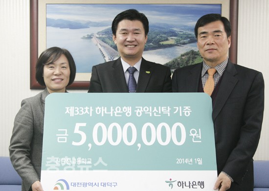 대덕구(구청장 정용기)는 23일 구청 구민의사랑방에서 하나은행 대전영업본부 전무(천경미)와 신탄진고등학교장(윤호진)이 참석한 가운데 하나은행이 기부한 공익신탁기금 전달식을 가졌다고 밝혔다.