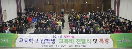 대덕구(구청장 정용기)는 4일 구청 대강당에서 예비고등학생 및 학부모 등 250여명이 참여한 가운데 ‘2014 행복나눔 고등학교 입학생 교복비 전달식’을 가졌다.
