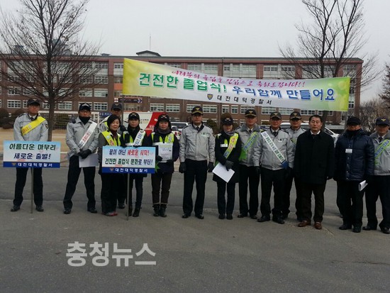 대전대덕경찰서장(서장 이동기)은 6일 오전 대전시 대덕구 덕암동 소재 신탄중앙중학교 등 2개소 졸업식장에서 강압적 졸업식 뒤풀이 예방을 위한 경찰 24명, 협력단체인 30명, 학교 교직원과 합동 캠페인 및 순찰활동을실시했다.