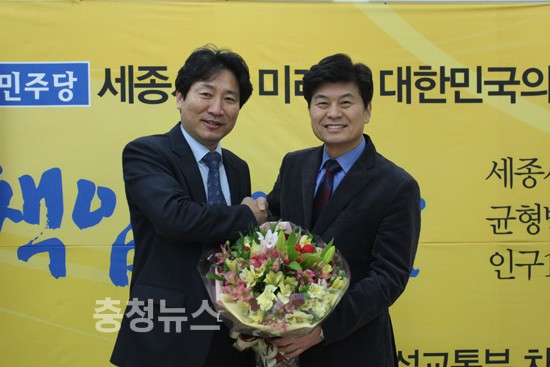 윤 기자는 13일 민주당 세종시당에서 이춘희 세종시장 예비후보를 비롯한 20여 명의 당원과 지지자들이 보는 앞에서 입당원서에 서명했다.