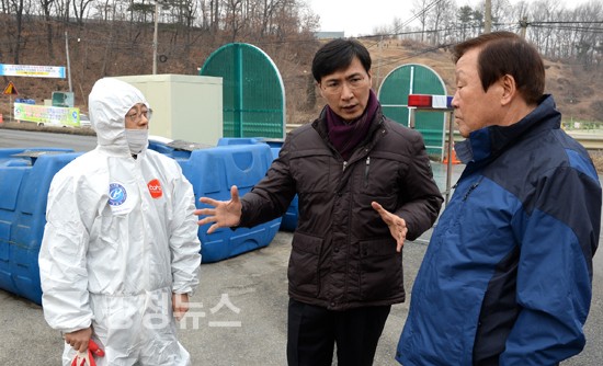 안희정 지사는 16일 천안 풍세면 AI 발생 농가 인근 초소를 잇따라 찾았다. 이 자리에서 안 지사는 관계자들을 격려한 뒤, 방역 상황을 살피고 철저한 차단 방역을 당부했다.