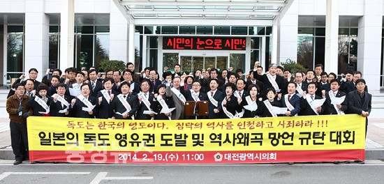 대전시의회(의장 곽영교)는 19일 제212회 대전시의회 임시회 제2차 본회의에서 김경시의원의 대표발의로 '일본의 독도 영유권 도발 및 역사왜곡 규탄 결의안'을 채택하고 시의회 현관에서 규탄대회를 개최했다.
