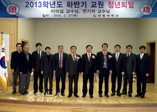 한밭대(총장 이원묵)는 27일 오전 산학연협동관(S5동) 2층 다목적홀에서 이의길 교수(신소재공학과)와 연기석 교수(도시공학과)에 대한 2013학년도 하반기 교원 정년퇴임식 행사를 가졌다.