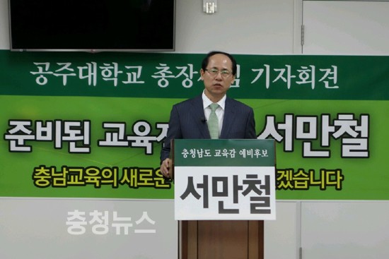 서만철 예비후보는 공주대 총장사임 기자회견문을 통해 “출마하더라도 교육부에 질의한 결과 총장직을 유지할 수 있다는 답변을 얻었다”면서 “하지만 총장직을 유지하면서 선거에 임하는 것은 공주대와 구성원에 대한 예의가 아니며, 위기에 처한 충남교육을 바로 세우겠다고 교육감 출마를 결심한 진정성에도 맞지 않아 사퇴를 결심했다”고 밝혔다.
